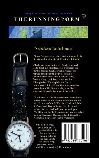 Wo Worte Orte weisen...DAS UKRAINEHAUS - Ein Buch aus der Reihe der Sportkunstliteratur von Odin Milan Stiura. Auch wenn es bei diesem Werk nicht explizit um das literarische Ergebnis, hervorgerufen durch den Extremsport geht, so wie es bei den bisherigen Büchern aus dieser Reihe der Fall war. Es ist zwar immer noch in der typischen Ad-hoc-Eigenheit des Langstreckenläufers kreiert, doch diesmal verbindet er in einer Art Erzählform mehr den Spott (als den Sport) mit der oder sogar über die Kunst zur Literatur. Die Kunstidee, nach deren Prinzip das vorliegende TRP© verfasst wurde, entstammt dem Friedens- und Kunstprojekt ´Grenzland-Ukraine`. Der Autor verfolgt über ein Jahr lang, von der Entstehungsgeschichte, über die Realisierungsphase und bis zum Verkauf des Projektes, das Schicksal eines alten Gebäudes an einer viel befahrenen Bundesstraße im Herzen vom Vogtland. Und genau diese ´Alte Schule` bildet das Sujet vorliegender Literaturkunst. Es ist eine Analogie zur Situation in der Ukraine.THERUNNINGPOEM© ist eine Literaturgattung weit ab vom Schulweg der Wissenschaft, die alles, was beim Rennen, Laufen, Gehen durch die Sinne läuft, geht und rennt, ungefiltert, rein im Gedanken wiedergibt. TRP© nimmt seine >Kraft aus dem Odem der Umgebung. Einatmen ist, Ausatmen ist. All das, was dem Autor durch seine Tasten auf das Papier springt, ist die sofortige Niederschrift seiner Gedanken nach dem Lauf, dem Run in freier Natur. Es gibt dabei kein Lektorat oder Reflexion, keine inhaltliche Regulierung, keine nachträgliche Verbesserung, Sortierung oder Entfernung einer zusammenhängenden Textpassage. TRP© kann deshalb durchaus verletzend, subversiv, irreführend, suggestiv, schönmalerisch, dramatisch oder einfach nur die subjektive Wahrheit sein. Die Wahrheit des Läufers, dem Dauerrenner !