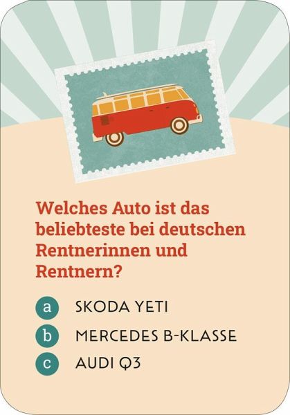Quizkarten mit Spaßfaktor: 50 Fragen mit je 3 AntwortmöglichkeitenInformativ: Die Antworten auf der Kartenrückseite vermitteln neues WissenEin Blick in die Geschichte: Die Fragen beziehen sich vor allem auf die Zeit von 1960 bis 1990Hochwertiges Design: Die Kartenbox lässt sich auf Reisen oder in der Freizeit gut mitnehmenPerfektes Mitbringsel: Für die Mama, den Papa, die Nachbarin, den Kollegen oder die Chefin, die sich in den Ruhestand verabschieden