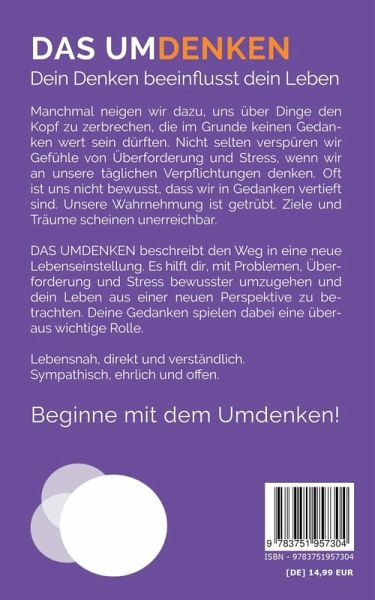 DAS UMDENKENDein Denken beeinflusst dein LebenManchmal neigen wir dazu, uns über Dinge den Kopf zu zerbrechen, die im Grunde keinen Gedanken wert sein dürften. Nicht selten verspüren wir Gefühle von Überforderung und Stress, wenn wir an unsere täglichen Verpflichtungen denken. Oft ist uns nicht bewusst, dass wir in Gedanken vertieft sind. Unsere Wahrnehmung ist getrübt. Ziele und Träume scheinen unerreichbar.DAS UMDENKEN beschreibt den Weg in eine neue Lebenseinstellung. Es hilft dir, mit Problemen, Überforderung und Stress bewusster umzugehen und dein Leben aus einer neuen Perspektive zu betrachten. Deine Gedanken spielen dabei eine besondere Rolle.Lebensnah, direkt und verständlich. Sympathisch, ehrlich und offen. Beginne mit dem Umdenken!- Klappentext Ende -Für wen eignet sich "Das Umdenken"?Es hört sich nach einer Pauschalantwort an, doch das Umdenken eignet sich für jeden. Es eignet sich nicht nur für Menschen, die sich derzeit in einer schwierigen Lage befinden und deshalbin Büchern nach etwas Unterstützung und Rat suchen. Es eignet sich nicht nur für überforderte Mütter und Väter, nicht nur für gestresste Führungskräfte und Manager, sondern für jeden, der sich mit sich selbst und den eigenen Gedanken beschäftigen möchte. Im Grunde haben wir alle ähnliche Probleme und oftmals ist es der Umgang mit Problemen an sich. Wenn wir lernen, uns diesen Themen zu widmen und unser Bewusstsein steigern, haben wir die Möglichkeit, die Dinge aus einer neuen Perspektive zu betrachten. Eine Perspektive, die unsere Wahrnehmung und unsere Empfindsamkeit ausbalanciert.Was unterscheidet "Das Umdenken" von anderen Lebensratgebern?Das Umdenken legt seinen Fokus auf das Bewusstsein und die Zusammenhänge zwischen Erfahrung, Einstellung und Wahrnehmung. Der Leser wird an die Hand genommen und durch wichtige Etappen des Bewusstseins und des Denkens mitgenommen, um dann zu gewisser Zeit das Umdenken kennenzulernen. Das Besondere am Umdenken ist, dass Leser nicht mit einer Lebenseinstellung alleine gelassen werden. Das Leben ändert sich nicht, nur weil man fortan positiv denkt oder ruhiger und gelassener auf Probleme reagiert. Das Leben macht weiter wie bisher. Entsprechend sollte man beim Schließen eines Lebensratgeber-Buches auch darauf vorbereitet werden, was auf einen zukommt und wie man fortan auf plötzlich auftretende Probleme reagieren sollte. An dieser Stelle setzt das Umdenken an. Ein Lebensratgeber, der langfristig hilft.