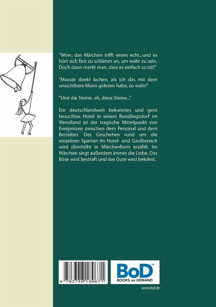 "Wow; das Märchen trifft einen echt...und es hört sich fast zu schlimm an, um wahr zu sein. Doch dann merkt man, dass es einfach so ist!!""Musste direkt lachen, als ich das mit dem unsichtbare Mann gelesen habe, zu wahr!""Und die Steine, oh, diese Steine..."Ein deutschlandweit bekanntes und gern besuchtes Hotel in einem Rundlingsdorf im Wendland ist der tragische Mittelpunkt von Ereignissen zwischen dem Personal und dem Betreiber. Das Geschehen rund um die einzelnen Sparten im Hotel- und Gastbereich wird überhöht in Märchenform erzählt. Im Märchen siegt außerdem immer die Liebe. Das Böse wird bestraft und das Gute wird belohnt.