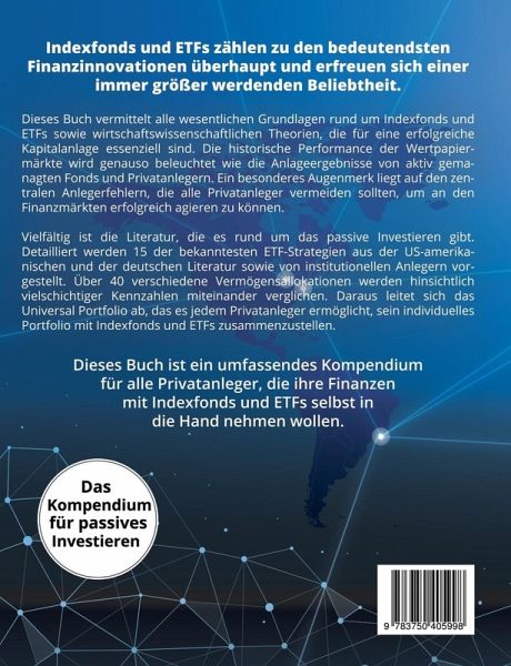 Indexfonds und ETFs zählen zu den bedeutendsten Finanzinnovationen überhaupt und erfreuen sich einer immer größer werdenden Beliebtheit. Dieses Buch vermittelt auf über 550 Seiten alle wesentlichen Grundlagen rund um Indexfonds und ETFs sowie wirtschaftswissenschaftlichen Theorien, die für eine erfolgreiche Kapitalanlage essenziell sind. Die historische Performance der Wertpapiermärkte wird genauso beleuchtet wie die Anlageergebnisse von aktiv gemanagten Fonds und Privatanlegern. Ein besonderes Augenmerk liegt auf den zentralen Anlegerfehlern, die alle Privatanleger vermeiden sollten, um erfolgreich an den Finanzmärkten agieren zu können.Vielfältig ist die Literatur, die es rund um das passive Investieren gibt. Dieses Buch stellt 15 der bekanntesten ETF-Strategien aus der US-amerikanischen (z. B. All Weather Portfolio von Ray Dalio, Permanent Portfolio von Harry Browne, 7Twelve Portfolio von Craig L. Israelsen etc.) und deutschen Literatur (z. B. Weltportfolio von Gerd Kommer, ARERO Weltfonds von Prof. Manfred Weber, Portfolios von Gottfried Heller etc.) detailliert vor. Viele weitere Portfolios (z. B. Merriman Ultimate Portfolio von Paul Merriman, Ideal Index Portfolio von Frank Armstrong etc.) komplettieren einen breiten Gesamtüberblick. In Summe werden über 40 Vermögensallokationen vorgestellt und hinsichtlich vielschichtiger Kennzahlen miteinander verglichen. Das Buch ist dahingehend einzigartig in der deutschsprachigen Literatur.Mit dem integrierten Ansatz kann der Privatanleger, unter Berücksichtigung des individuellen Rendite-Risiko-Profils und des Anlagehorizonts, einen Orientierungswert für die Vermögensallokation eruieren. Aus allen Erkenntnissen leitet sich das Universal Portfolio ab, das es jedem Privatanleger ermöglicht, sein individuelles Portfolio mit Indexfonds und ETFs zusammenzustellen. Das Buch führt Schritt-für-Schritt zum persönlichen "idealen Portfolio".Das Buch vermittelt eine breite Wissensbasis, um die Finanzmärkte besser zu verstehen. Gleichzeitig werden viele praxisnahe Tipps gegeben, um eine nachhaltige und langfristige Kapitalanlage zu verwirklichen. Viele interessante Exkurse und über 150 Abbildungen vertiefen relevante Zusammenhänge. Dieses Buch ist ein umfassendes Kompendium für alle Privatanleger, die ihre Finanzen mit Indexfonds und ETFs selbst in die Hand nehmen wollen. Es eignet sich sowohl für wirtschaftswissenschaftlich interessierte Leser, als auch für ambitionierte Privatanleger.