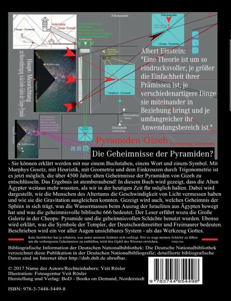 Die Gravitation ausgleichen? Bauliche Einrichtungen und geheimnisvolle Steine in den Pyramiden deuten auf die Erforschung dieses astrophysikalischen Phänomens im Ägypten des Altertums hin. Mit der II. Auflage des Titels "Das Universum in der Königskammer - Ausgleich der Gravitation mit der Cheops- Pyramide" werden mit den "Geheimnissen von Isis Maria Stella Maris" in weiteren neun Kapiteln auf nun 532 Seiten die in der Urfassung beschriebenen geometrischen, astronomischen und geschichtlichen Aussagen untermauert. Erneut bestätigt sich der Spruch Albert Einsteins: "Eine Theorie ist um so eindrucksvoller, je größer die Einfachheit ihrer Prämissen ist, je verschiedenartigere Dinge sie miteinander in Beziehung bringt und je umfangreicher ihr Anwendungsbereich ist." Selbst scheinbar unwiederbringlich in Vergessenheit geratene Pyramidengeheimnisse lassen sich mit ineinander kombinierten wissenschaftlichen Verfahren enträtseln. Die Geheimnisse der Pyramiden? Sie können erklärt werden mit nur einem Buchstaben, einem Wort und einem Symbol. Mit Murphys Gesetz, mit Heuristik, mit Geometrie und dem Einkreuzen durch Trigonometrie ist es jetzt möglich, die über 4500 Jahre alten Geheimnisse der Pyramiden von Gizeh zu entschlüsseln. Das Ergebnis ist atemberaubend! In diesem Buch wird gezeigt, dass die Alten Ägypter weitaus mehr wussten, als wir in der heutigen Zeit für möglich halten. Dabei wird dargestellt, wie die Menschen des Altertums die Geschwindigkeit von Licht vermessen haben und wie sie die Gravitation ausgleichen konnten. Gezeigt wird auch, welches Geheimnis der Sphinx in sich trägt, was die Wassermassen beim Auszug der Israeliten aus Ägypten bewegt hat und was die geheimnisvolle biblische 666 bedeutet. Der Leser erfährt wozu die Große Galerie in der Cheops- Pyramide und die geheimnisvollen Schächte benutzt wurden. Ebenso wird erklärt, was die Symbole der Templer, der Deutschordensritter und Freimaurer bedeuten. Beschrieben wird ein vor aller Augen unsichtbaresSystem - als das Werkzeug Gottes.Ausgabe Paperback - Mittelgroße Schrift - Mit 204 Farbtafeln und Bildern sowie 6 Schwarz-Weiß-Bildern