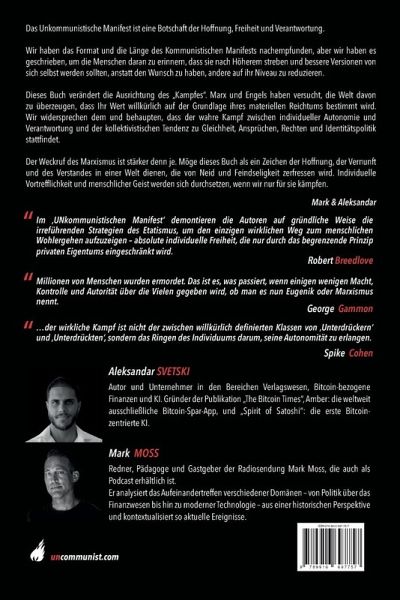 Wir schrieben Das UNkommunistische Manifest in der Hoffnung, dass es in dem Kampf zwischen Individueller Souveränität und Kollektivem Zwang, der um uns herum tobt, als Inspiration dienen möge. Wir ahmten sowohl Format als auch Umfang des Kommunistischen Manifests nach, schrieben es jedoch als eine Erinnerung daran um, aufwärts zu greifen und eine bessere Version seiner selbst zu werden, anstatt sich selbst in statische Gruppen zu klassifizieren und Befriedigung darin zu suchen, andere auf das eigene Niveau herabzuziehen. Unser Ziel war es, die Achse dieses "Kampfes" zu verlagern. Marx und Engels beschrieben ihn als einen "Kampf zwischen zwei Klassen" denen ein Individuum aufgrund seines materiellen Wohlstands willkürlich zugeordnet wird. Wir lehnen dies ab und behaupten, dass der wirkliche Kampf zwischen individueller Autonomie, Souveränität sowie Verantwortung auf der einen Seite und den kollektivistischen Tendenzen gruppenbasierter Identitätspolitiken, Rechte, Privilegien sowie Abhängigkeiten auf der anderen stattfindet. Unsere längerfristige Hoffnung ist, dass dieser Text ein Leuchtturm der Hoffnung, Zurechnungsfähigkeit und Vernunft in einer Welt sein wird, die der aller marxistischen Doktrin entströmende Neid einhüllt. Der Sirenengesang der marxistischen Entropie erklingt lauter denn je. Größe und Unantastbarkeit des Individuums müssen ihm entgegentreten. Dies ist die erste Ausgabe und wir hoffen, dass Du tiefe Sinnhaftigkeit und neues Licht in ihr vorfindest. Mark & Aleks