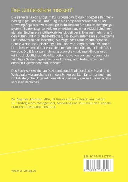 Die Bewertung von Erfolg im Kulturbetrieb wird durch spezielle Rahmenbedingungen und die Einbettung in ein komplexes Stakeholder- und Umweltgefüge erschwert, dies gilt insbesondere für das Beschäftigungssystem Theater. Dagmar Abfalter entwickelt aus einer Vielzahl eindimensionaler Studien ein multifaktorielles Modell der Erfolgswahrnehmung für den Kultur- und Musiktheaterbetrieb, das sowohl interne als auch externe Einflussfaktoren berücksichtigt. Sie zeigt, dass gemeinsame organisationale Werte und Zielsetzungen im Sinne von "organisationalen Maps" bestehen, welche durch verschiedene Rahmenbedingungen beeinflusst werden. Die Erfolgswahrnehmung erweist sich als multidimensional, wirkt sich deutlich auf die Mitarbeitermotivation aus und ist somit ein wichtiges Gestaltungselement der Führung in Kulturbetrieben und anderen ExpertInnenorganisationen.