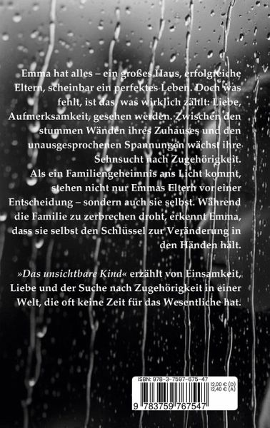 Emma hat alles - ein großes Haus, erfolgreiche Eltern, scheinbar ein perfektes Leben. Doch was fehlt, ist das, was wirklich zählt: Liebe, Aufmerksamkeit, gesehen werden. Zwischen den stummen Wänden ihres Zuhauses und den unausgesprochenen Spannungen wächst ihre Sehnsucht nach Zugehörigkeit. Als ein Familiengeheimnis ans Licht kommt, stehen nicht nur Emmas Eltern vor einer Entscheidung - sondern auch sie selbst. Während die Familie zu zerbrechen droht, erkennt Emma, dass sie selbst den Schlüssel zur Veränderung in den Händen hält. »Das unsichtbare Kind« erzählt von Einsamkeit, Liebe und der Suche nach Zugehörigkeit in einer Welt, die oft keine Zeit für das Wesentliche hat