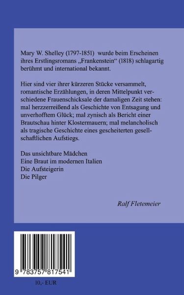 Mary W. Shelley (1797-1851) wurde beim Erscheinen ihres Erstlingsromans "Frankenstein" (1818) schlagartig berühmt und international bekannt. Hier sind vier ihrer kürzeren Stücke versammelt, romantische Erzählungen, in deren Mittelpunkt verschiedene Frauenschicksale der damaligen Zeit stehen: mal herzzerreißend als Geschichte von Entsagung und unverhofftem Glück; mal zynisch als Bericht einer Brautschau hinter Klostermauern; mal melancholisch als tragische Geschichte eines gescheiterten gesellschaftlichen Aufstiegs.Das unsichtbare MädchenEine Braut im modernen ItalienDie AufsteigerinDie Pilger