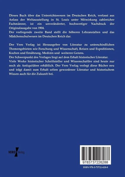 Dieses Buch über das Unterrichtswesen im Deutschen Reich, verfasst aus Anlass der Weltausstellung in St. Louis unter Mitwirkung zahlreicher Fachmänner, ist ein unveränderter, hochwertiger Nachdruck der Originalausgabe von 1904.