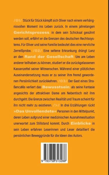 01/ Stück für Stück kämpft sich Oliver nach einem verhängnisvollen Moment ins Leben zurück. In einem jahrelangen Gerichtsprozess, in dem sein Schicksal gesühnt werden soll, erfährt er die Grenzen des deutschen Rechtssystems. Für Oliver und seine Familie bedeutet dies eine nervliche Zerreißprobe. /02/ Eine seltene Erkrankung drängt Lanz an den Rand der Gesellschaft. Um am Leben anderer teilhaben zu können, studiert er die zurückgelassenen Kassenzettel seiner Mitmenschen. Während einer plötzlichen Auseinandersetzung muss er zu seiner ihm fremd gewordenen Persönlichkeit zurückkehren. /03/ Der Gast eines Straßencafés verliert das Bewusstsein, als seine Fantasie angesichts der attraktiven Dame am Nebentisch mit ihm durchgeht. Die Grenze zwischen Realität und Traum scheint für ihn nicht mehr zu existieren. />/ In drei Erzählungen rückt »Das Unvollendete« Personen in den Mittelpunkt, deren Leben aufgrund einer medizinischen Ausnahmesituation unerwartet zum Stillstand kommt. Durch Einblicke in sein Leben erfahren Leserinnen und Leser detailliert die persönlichen Beweggründe für die Ideen des Autors.