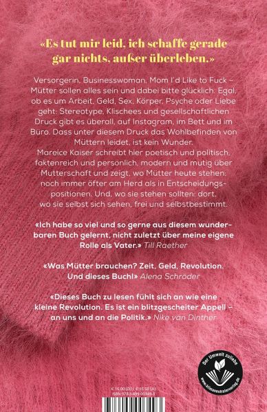 Versorgerin, Businesswoman, Mom I'd like to fuck - Mütter sollen heute alles sein. Dass darunter ihr Wohlbefinden leidet, ist kein Wunder. Mareice Kaiser, Journalistin und selbst Mutter, stellt immer wieder fest: Das Mutterideal ist unerreichbar und voller Widersprüche. Nichts kann man richtig machen und niemandem etwas recht. Mutterschaft berührt dabei, natürlich, jeden Lebensbereich: Denn egal, ob es um Arbeit, Geld, Sex, Körper, Psyche oder Liebe geht - Stereotype, Klischees und gesellschaftlichen Druck gibt es überall, auf Instagram, im Bett und im Büro. Mareice Kaiser zeigt, wo Mütter heute stehen: noch immer öfter am Herd als in den Chefetagen. Und, wo sie stehen sollten: Dort, wo sie selbst sich sehen - frei und selbstbestimmt.