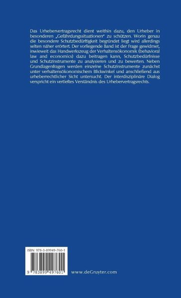 Copyright contract law mainly serves to protect the creator in particularly "hazardous situations". The reasoning behind the particular need for protection is seldom discussed. Dedicated to this issue, this work considers the extent to which tools of behavioral law and economics can contribute to the analysis and assessment of the need for protection and the instruments of protection. In addition to fundamental questions, individual instruments of protection are examined from the behavioral law and economics perspective and followed by insights from the copyright perspective. The interdisciplinary dialog promises a deeper understanding of copyright contract law.