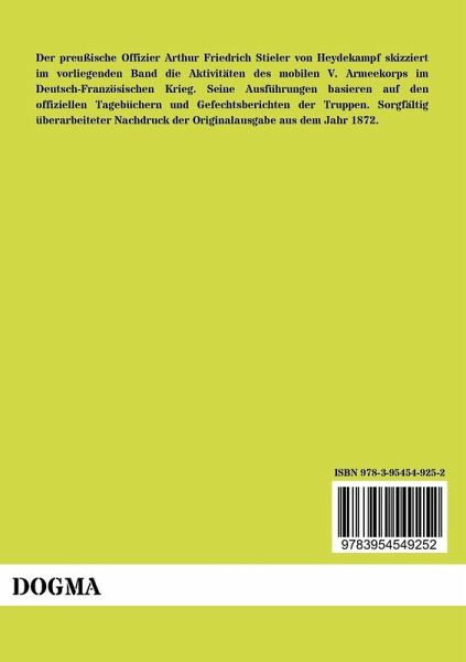 Der preußische Offizier Arthur Friedrich Stieler von Heydekampf skizziert im vorliegenden Band die Aktivitäten des mobilen V. Armeekorps im Deutsch-Französischen Krieg. Seine Ausführungen basieren auf den offiziellen Tagebüchern und Gefechtsberichten der Truppen. Sorgfältig überarbeiteter Nachdruck der Originalausgabe aus dem Jahr 1872.