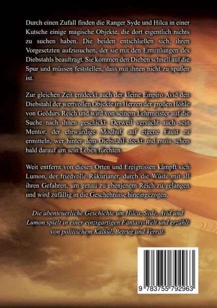 Durch einen Zufall finden die Ranger Syde und Hilca in einer Kutsche einige magische Objekte, die dort eigentlich nichts zu suchen haben. Die beiden entschließen sich, ihren Vorgesetzten aufzusuchen, der sie mit den Ermittlungen des Diebstahls beauftragt. Sie kommen den Dieben schnell auf die Spur und müssen feststellen, dass mit ihnen nicht zu spaßen ist. Zur gleichen Zeit entdeckt auch der kleine Empiro Avid den Diebstahl der wertvollen Objekte im Herzen der großen Höhle von Geêdurs Reich und wird von seinem Lehrmeister auf die Suche nach ihnen geschickt. Derweil versucht auch sein Mentor, der ehrwürdige Modhuf, auf eigene Faust zu ermitteln, wer hinter dem Diebstahl steckt und muss schon bald darauf um sein Leben fürchten. Weit entfernt von diesen Orten und Ereignissen kämpft sich Lumon, der friedvolle Rûkurianer, durch die Wüste mit all ihren Gefahren, um genau zu ebenjenem Reich zu gelangen, und wird zufällig in die Geschehnisse hineingezogen. Die abenteuerliche Geschichte um Hilca, Syde, Avid und Lumon spielt in einer einzigartigen Fantasy-Welt und erzählt von politischem Kalkül, Betrug und Verrat.Im Buch enthalten sind vom Autor entworfene Karten und Handzeichnungen.