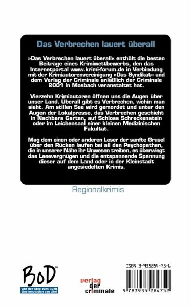 "Das Verbrechen lauert überall" enthält die besten Beiträge des Krimiwettbewerbs in Verbindung mit der Krimiautorenvereinigung `Das Syndikat` und dem Verlag der Criminale anläßlich der Criminale 2001 in Mosbach (Baden-Württemberg) im Frühjahr 2001 veranstaltet hat. Vierzehn Krimiautoren haben sich in dieser Anthologie zusammengefunden, um uns die Augen über unser Land zu öffnen. Das Verbrechen lauert nicht nur in verkommenen Vierteln der Großstädte, auch im idyllischen Mosbach kann der Neckar Zeuge eines raffiniert eingefädelten Gattenmordes werden.