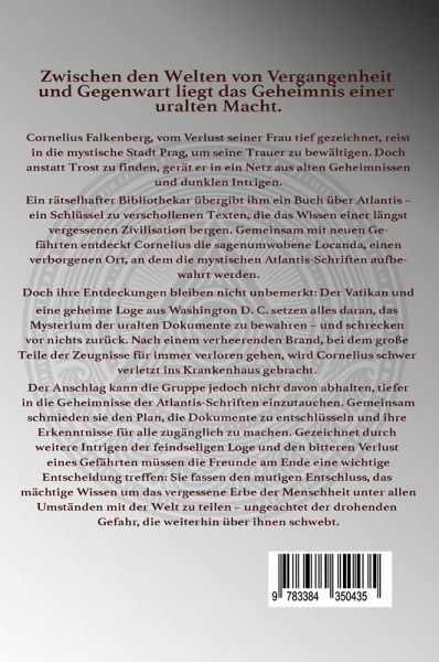 Zwischen den Welten von Vergangenheit und Gegenwart liegt das Geheimnis einer uralten Macht.Cornelius Falkenberg, vom Verlust seiner Frau tief gezeichnet, reistin die mystische Stadt Prag, um seine Trauer zu bewältigen. Dochanstatt Trost zu finden, gerät er in ein Netz aus alten Geheimnissen und dunklen Intrigen. Ein rätselhafter Bibliothekar übergibt ihm ein Buch über Atlantis -ein Schlüssel zu verschollenen Texten, die das Wissen einer längstvergessenen Zivilisation bergen. Gemeinsam mit neuen Ge-fährten entdeckt Cornelius die sagenumwobene Locanda, einenverborgenen Ort, an dem die mystischen Atlantis-Schriften aufbe-wahrt werden.Doch ihre Entdeckungen bleiben nicht unbemerkt: Der Vatikan undeine geheime Loge aus Washington D. C. setzen alles daran, das Mysterium der uralten Dokumente zu bewahren - und schrecken vor nichts zurück. Nach einem verheerenden Brand, bei dem große Teile der Zeugnisse für immer verloren gehen, wird Cornelius schwer verletzt ins Krankenhaus gebracht. Der Anschlag kann die Gruppe jedoch nicht davon abhalten, tieferin die Geheimnisse der Atlantis-Schriften einzutauchen. Gemeinsamschmieden sie den Plan, die Dokumente zu entschlüsseln und ihre Erkenntnisse für alle zugänglich zu machen. Gezeichnet durch weitere Intrigen der feindseligen Loge und den bitteren Verlust eines Gefährten müssen die Freunde am Ende eine wichtigeEntscheidung treffen: Sie fassen den mutigen Entschluss, das mächtige Wissen um das vergessene Erbe der Menschheit unter allenUmständen mit der Welt zu teilen - ungeachtet der drohenden Gefahr, die weiterhin über ihnen schwebt.