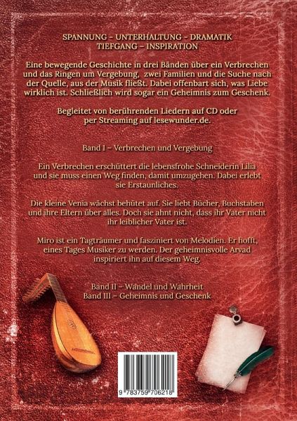 Ein bewegender Roman in drei Bänden über ein Verbrechen und das Ringen um Vergebung, zwei Familien und die Suche nach der Quelle, aus der Musik fließt. Dabei offenbart sich, was Liebe wirklich ist. Schließlich wird sogar ein Geheimnis zum Geschenk.Begleitet von berührenden Liedern auf CD oder per Streaming auf lesewunder.deBand I - Verbrechen und Vergebung Ein Verbrechen erschüttert die lebensfrohe Schneiderin Lilia und sie muss einen Weg finden, damit umzugehen. Dabei erlebt sie Erstaunliches. Die kleine Venia wächst behütet auf. Sie liebt Bücher, Buchstaben und ihre Eltern über alles. Doch sie ahnt nicht, dass ihr Vater nicht ihr leiblicher Vater ist.Miro ist ein Tagträumer und fasziniert von Melodien. Er hofft, eines Tages Musiker zu werden. Der geheimnisvolle Arvad inspiriert ihn auf diesem Weg.