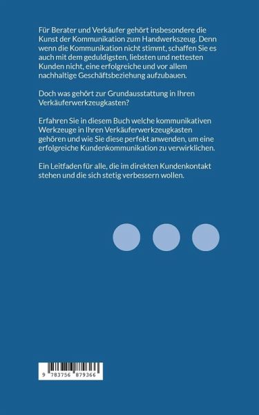 Für Berater und Verkäufer gehört insbesondere die Kunst der Kommunikation zum Handwerkszeug. Denn wenn die Kommunikation nicht stimmt, schaffen Sie es auch mit dem geduldigsten, liebsten und nettesten Kunden nicht, eine erfolgreiche und vor allem nachhaltige Geschäftsbeziehung aufzubauen. Doch was gehört zur Grundausstattung in Ihren Verkäuferwerkzeugkasten?Erfahren Sie in diesem Buch welche kommunikativen Werkzeuge in Ihren Verkäuferwerkzeugkasten gehören und wie Sie diese perfekt anwenden, um eine erfolgreiche Kundenkommunikation zu verwirklichen.Ein Leitfaden für alle, die im direkten Kundenkontakt stehen und die sich stetig verbessern wollen.