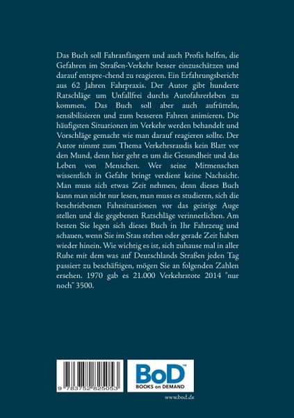 Das Buch soll Fahranfängern und auch Profis helfen, die Gefahren im Straßen-Verkehr besser einzuschätzen und darauf entsprechend zu reagieren. Ein Erfahrungsbericht aus 62 Jahren Fahrpraxis. Der Autor gibt hunderte Ratschläge um Unfallfrei durchs Autofahrerleben zu kommen. Das Buch soll aber auch aufrütteln, sensibilisieren und zum besseren Fahren animieren. Die häufigsten Situationen im Verkehr werden behandelt und Vorschläge gemacht wie man darauf reagieren sollte. Der Autor nimmt zum Thema Verkehrsraudis kein Blatt vor den Mund, denn hier geht es um die Gesundheit und das Leben von Menschen. Wer seine Mitmenschen wissentlich in Gefahr bringt verdient keine Nachsicht. Man muss sich etwas Zeit nehmen, denn dieses Buch kann man nicht nur lesen, man muss es studieren, sich die beschriebenen Fahrsituationen vor das geistige Auge stellen und die gegebenen Ratschläge verinnerlichen. Am besten Sie legen sich dieses Buch in Ihr Fahrzeug und schauen, wenn Sie im Stau stehen oder gerade Zeit haben wieder hinein. Wie wichtig es ist, sich zuhause mal in aller Ruhe mit dem was auf Deutschlands Straßen jeden Tag passiert zu beschäftigen, mögen Sie an folgenden Zahlen ersehen. 1970 gab es 21.000 Verkehrstote 2014 "nur noch" 3500. Das hört sich zunächst gut an, ist aber hauptsächlich auf das verbesserte Fahrkönnen und die Sicherheitstechnik der Fahrzeuge zurückzuführen. Zu beklagen ist jedoch, dass durch die ins Fahrzeug rein geschlichenen Infotainment- und Kommunikationstechnik, die Zahl der Unfälle wieder steigt. Volkswirtschaftlich gesehen entstehen jedes Jahr 30 Millarden Kosten, davon könnte man einiges einsparen, wenn man sie mit dem Drücken des Zündschlüssels abschalten würde. möchten.
