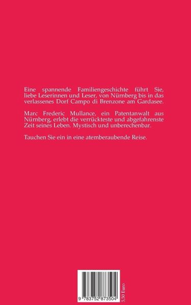 Eine spannende Familiengeschichte führt Sie, liebe Leserinnen und Leser, von Nürnberg bis in das verlassenes Dorf Campo di Brenzone am Gardasee.Marc Frederic Mullance, ein Patentanwalt aus Nürnberg, erlebt die verrückteste und abgefahrenste Zeit seines Leben. Mystisch und unberechenbar.Tauchen Sie ein in eine atemberaubende Reise.