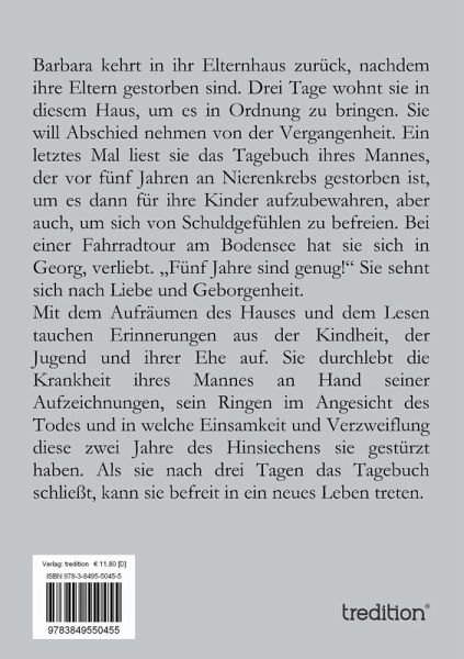 Barbara kehrt nach dem Tod ihrer Eltern in ihr Elternhauszurück. Drei Tage wohnt sie dort, um das Haus aufzuräumen und um es gemeinsam mit ihrem Bruder zu verkaufen. Sie nimmt Abschied von der Vergangenheit. Dazu zählt auch die Auseinandersetzung mit ihrenEltern, vor allem mit ihrer Mutter, die ein anderes Leben für sie plante. In ihrer Jugend und auch später überhäuft sie Barbara mit Vorwürfen. Im Elternhaus liest sie ein letztes Mal das Tagebuch Konrads, der vor fünf Jahren an Nierenkrebs starb, um es dann für ihre Kinder Susanne und Lukas aufzubewahren, aber auch, um sich von Schuldgefühlen zu befreien.Mit dem Aufräumen des Hauses und dem Lesen tauchen Erinnerungen aus ihrer Kindheit, ihrer Jugend und dengemeinsamen Jahren auf. Bei Konrads Bemerkungen "Barbara, erinnerst du dich?", entsinnt sie sich an die Jahre ihrer Ehe, die Geburt ihrer Kinder und an gemeinsame Urlaube.Sie durchlebt beim Lesen seines Tagebuchs noch einmal die Krankheit ihres Mannes, seine Verzweiflung und seine Hoffnung, davon gekommen zu sein. Zwei Jahre schleppt sie das Wissen um die Ausweglosigkeit mit sich herum; diese zwei Jahre seines Hinsiechens stürzen sie in Einsamkeit und Verzweiflung und lassen sie schuldigwerden. Im Angesicht der Krankheit und des Todes ringt Konrad um seinen Gottesglauben, seinen Hoffnungen, dem Woher und Wohin; sie diskutierten über seine ureigenenFragen und Gedanken. In den Tagebuchaufzeichnungen über das letzte gemeinsame Weihnachtsfest, wenige Wochen vor seinem Tod,kristallisieren sich noch einmal Konrads Gedanken und Gefühle, die sich bei Barbara tief in ihrem Gedächtnis einprägen. Nach fünf Jahren lernt sie bei einer Fahrradtour am Bodensee, an der sie auf Drängen ihrer Kinder in einerGruppe teilnimmt, Georg kennen und verliebt sich. "Fünf Jahre sind genug!" Sie sehnt sich nach Liebe und Geborgenheit. "Mama, du hast getan, was du konntest!" DieserSatz ihrer Kinder nach dem Tod des Vaters tröstet sie. Als sie nach drei Tagen das Tagebuch schließt, kann sie befreit ein neues Leben beginnen. "Lebe", ist das letzte Wort im Abschiedsbrief Konrads.