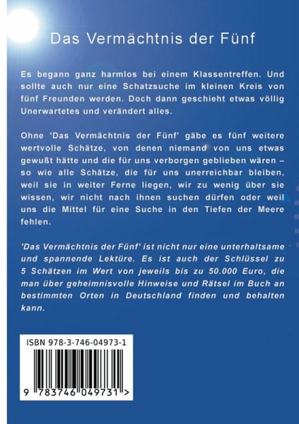 Das Buch ist eine Komposition aus romanhafter Rahmengeschichte, spannenden Schatzgeschichten und Gedanken über die Schätze, die wir besitzen und die wir für so selbstverständlich halten, obwohl sie doch wertvoller als alles Gold sind. Über dem Buch schwebt die Botschaft: Carpe Diem! Nutze den Tag, jeden Tag.Einzigartig ist: mit den 5 Schatzgeschichten im Buch sind auch 5 echte in Deutschland verborgene Schätze verbunden, zu denen geheimnisvolle Hinweise im Buch führen. Jeder der 5 Schätze kann einen Wert von bis zu 50.000 Euro haben. Die Hinweise sind eindeutig, aber so rätselhaft, dass die Schatzsuche bis zum Finden des 5. Schatzes wohl lange spannend bleibt. Das Vermächtnis der Fünf ist aber erst einmal eine unterhaltsame Lektüre, die unseren Alltag mit neuen Gedanken und Träumen bereichern will. Es ist auch eine gute Gelegenheit für eine aktive Freizeitgestaltung: allein, mit der Familie, dem Partner oder mit Freunden.