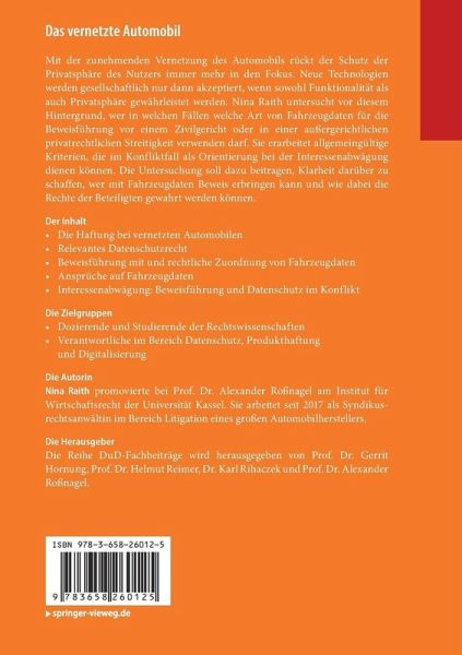Mit der zunehmenden Vernetzung des Automobils rückt der Schutz der Privatsphäre des Nutzers immer mehr in den Fokus. Neue Technologien werden gesellschaftlich nur dann akzeptiert, wenn sowohl Funktionalität als auch Privatsphäre gewährleistet werden. Nina Raith untersucht vor diesem Hintergrund, wer in welchen Fällen welche Art von Fahrzeugdaten für die Beweisführung vor einem Zivilgericht oder in einer außergerichtlichen privatrechtlichen Streitigkeit verwenden darf. Sie erarbeitet allgemeingültige Kriterien, die im Konfliktfall als Orientierung bei der Interessenabwägung dienen können. Die Untersuchung soll dazu beitragen, Klarheit darüber zu schaffen, wer mit Fahrzeugdaten Beweis erbringen kann und wie dabei die Rechte der Beteiligten gewahrt werden können.