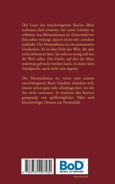Der Leser des verschwiegenen Buches Metarealismus darf erwarten, bei seiner Lektüre zu erfahren, was Metarealismus ist. Dazu wird von ihm selbst verlangt, dass er nicht mit-, sondern umdenkt. Der Metarealismus ist ein permanentes Umdenken. Er ist eine Sicht der Welt, die sich nicht definieren lässt. Sie steht so wenig still wie die Welt selbst. Der Punkt, auf den der Metarealismus gebracht werden kann, ist daher kein Standpunkt, auch nicht sein eigener.Der Metarealismus ist, wenn man seinem verschwiegenen Buch Glauben schenken will, immer schon ganz nah; allerdings dort, wo wir ihn nicht vermuten. Er markiert den Konvergenzpunkt von größtmöglicher Nähe und kleinstnötiger Distanz zur Normalität.