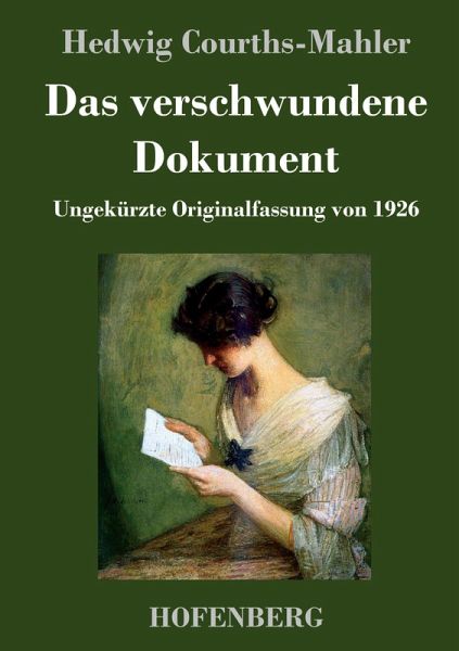 Hedwig Courths-Mahler: Das verschwundene Dokument. Ungekürzte Originalfassung von 1926Erstdruck: Leipzig, Verlag von Friedrich Rothbarth, 1926.Neuausgabe, herausgegeben von Karl-Maria Guth, Berlin 2023.Der Text dieser Ausgabe wurde behutsam an die neue deutsche Rechtschreibung angepasst.Umschlagabbildung: Julian Alden Weir, Der Brief, 1910Gesetzt aus der Minion Pro, 11 pt.Die Sammlung Hofenberg erscheint im Verlag Henricus - Edition Deutsche Klassik GmbH, Berlin