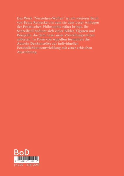 Das Werk "Verstehen-Wollen" ist ein weiteres Buch von Beate Reinecker, in dem sie dem Leser Anliegen der Praktischen Philosophie näherbringt. Ihr Schreibstil bedient sich vieler Bilder, Figuren und Beispiele, die dem Leser neue Vorstellungswelten anbieten. In Form von Appellen formuliert die Autorin Denkanstöße zur individuellen Persönlichkeitsentwicklung mit einer ethischen Ausrichtung.