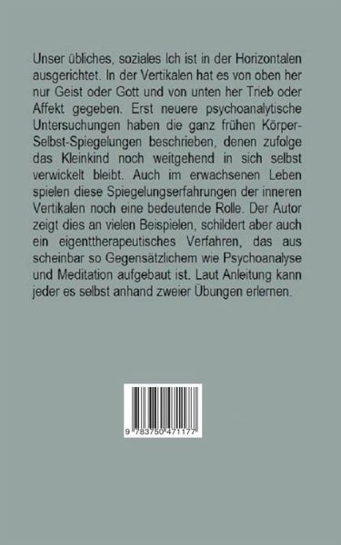 Unser übliches, soziales Ich ist in der Horizontalen ausgerichtet. In der Vertikalen hat es von oben her nur Geist oder Gott und von unten her Trieb oder Affekt gegeben. Erst neuere psychoanalytische Untersuchungen haben die ganz frühen Körper-Selbst-Spiegelungen beschrieben, denen zufolge das Kleinkind noch weitgehend in sich selbst verwickelt bleibt. Auch im erwachsenen Leben spielen diese Spiegelungserfahrungen der inneren Vertikalen noch eine bedeutende Rolle. Der Autor zeigt dies an vielen Beispielen, schildert aber auch ein eigentherapeutisches Verfahren, das aus scheinbar so Gegensätzlichem wie Psychoanalyse und Meditation aufgebaut ist. Laut Anleitung kann jeder dieses Analytische Psychokatharsis genannte Verfahren selbst anhand zweier Übungen erlernen.