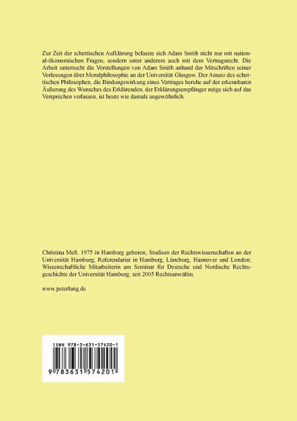 Zur Zeit der schottischen Aufklärung befasste sich Adam Smith nicht nur mit national-ökonomischen Fragen, sondern unter anderem auch mit dem Vertragsrecht. Die Arbeit untersucht die Vorstellungen von Adam Smith anhand der Mitschriften seiner Vorlesungen über Moralphilosophie an der Universität Glasgow. Der Ansatz des schottischen Philosophen, die Bindungswirkung eines Vertrages beruhe auf der erkennbaren Äußerung des Wunsches des Erklärenden, der Erklärungsempfänger möge sich auf das Versprechen verlassen, ist heute wie damals ungewöhnlich.
