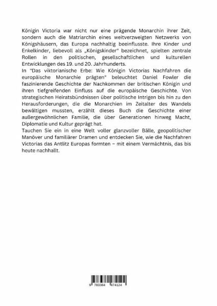 Königin Victoria war nicht nur eine prägende Monarchin ihrer Zeit, sondern auch die Matriarchin eines weitverzweigten Netzwerks von Königshäusern, das Europa nachhaltig beeinflusste. Ihre Kinder und Enkelkinder, liebevoll als "Königskinder" bezeichnet, spielten zentrale Rollen in den politischen, gesellschaftlichen und kulturellen Entwicklungen des 19. und 20. Jahrhunderts.In "Das viktorianische Erbe: Wie Königin Victorias Nachfahren die europäische Monarchie prägten" beleuchtet Daniel Fowler die faszinierende Geschichte der Nachkommen der britischen Königin und ihren tiefgreifenden Einfluss auf die europäische Geschichte. Von strategischen Heiratsbündnissen über politische Intrigen bis hin zu den Herausforderungen, die die Monarchien im Zeitalter des Wandels bewältigen mussten, erzählt dieses Buch die Geschichte einer außergewöhnlichen Familie, die über Generationen hin-weg Macht, Diplomatie und Kultur geprägt hat.Tauchen Sie ein in eine Welt voller glanzvoller Bälle, geopolitischer Manöver und familiärer Dramen und entdecken Sie, wie die Nachfahren Victorias das Antlitz Europas formten - mit einem Vermächtnis, das bis heute nachhallt.