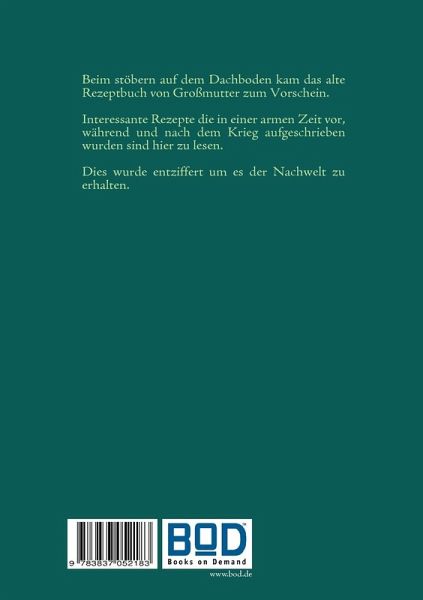 Beim stöbern auf dem Dachboden wurde ein altes handschriftliches Rezeptbuch von Großmutter entdeckt. Vieles wurde in altdeutscher Schrift verfaßt und konnte nur durch die Mithilfe vom Vater des Autors und seinen Tanten entziffert werden.Um die interessanten Aufzeichnungen der Nachwelt zu erhalten wurden sie in "neudeutsche Schrift" übersetzt und hier abgedruckt.Lassen Sie sich überraschen was damals, oft aus der Not heraus, entstand.