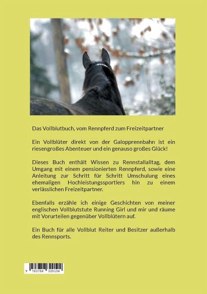 Das Vollblutbuch, vom Rennpferd zum FreizeitpartnerEin Vollblüter direkt von der Galopprennbahn ist ein riesengroßes Abenteuer und ein genauso großes Glück!Dieses Buch enthält Wissen zu Rennstallalltag, dem Umgang mit einem pensionierten Rennpferd, sowie eine Anleitung zur Schritt für Schritt Umschulung eines ehemaligen Hochleistungssportlers hin zu einem verlässlichen Freizeitpartner.Ebenfalls erzähle ich einige Geschichten von meiner englischen Vollblutstute Running Girl und mir und räume mit Vorurteilen gegenüber Vollblütern auf.Ein Buch für alle Vollblut Reiter und Besitzer außerhalb des Rennsports.