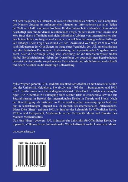 Mit dem Siegeszug des Internets, das als ein internationales Netzwerk von Computern den Nutzern Zugang zu umfangreichen Mengen an Informationen aus allen Teilen der Welt verschafft, sind neue Probleme für den Datenschutz verbunden. Diese Arbeit beschäftigt sich mit der daraus resultierenden Frage, ob der Einsatz von Cookies und Web Bugs durch öffentliche und nicht-öffentliche Anbieter von Internetdiensten datenschutzrechtlich zulässig ist und wenn ja, von welchen Bedingungen diese Zulässigkeit abhängt. Diese Frage des ob und wie der Cookies und Web Bugs im WWW wird nach Erläuterung der Grundlagen im Wege eines Vergleichs des U.S.-amerikanischen und des deutschen Rechts unter Einbeziehung der supranationalen Vorgaben untersucht. Auch die Selbstregulierung, ihre Bedeutung und die Datenschutzpraxis finden hierbei Berücksichtigung. Neben der Darstellung der gegenwärtigen Begebenheiten bewertet die Autorin die vorgefundenen Unterschiede und Ähnlichkeiten und schließt mit einem Ausblick in die zukünftige Entwicklung.