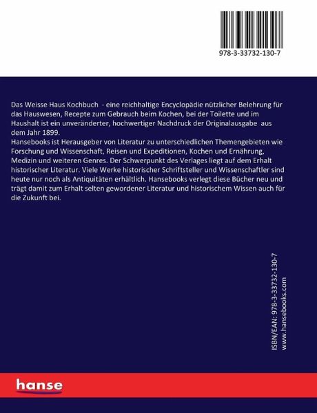 Das Weisse Haus Kochbuch - eine reichhaltige Encyclopädie nützlicher Belehrung für das Hauswesen, Recepte zum Gebrauch beim Kochen, bei der Toilette und im Haushalt ist ein unveränderter, hochwertiger Nachdruck der Originalausgabe aus dem Jahr 1899.Hansebooks ist Herausgeber von Literatur zu unterschiedlichen Themengebieten wie Forschung und Wissenschaft, Reisen und Expeditionen, Kochen und Ernährung, Medizin und weiteren Genres. Der Schwerpunkt des Verlages liegt auf dem Erhalt historischer Literatur. Viele Werke historischer Schriftsteller und Wissenschaftler sind heute nur noch als Antiquitäten erhältlich. Hansebooks verlegt diese Bücher neu und trägt damit zum Erhalt selten gewordener Literatur und historischem Wissen auch für die Zukunft bei.
