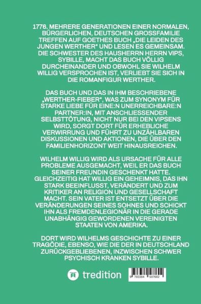 1776. Mehrere Generationen einer normalen, bürgerlichen, deutschen Großfamilie treffen auf Goethes Buch "Die Leiden des jungen Werther" und lesen es gemeinsam. Die Schwester des Hausherrn Herrn Vips, Sybille, macht das Buch völlig durcheinander und obwohl sie Wilhelm Willig versprochen ist, verliebt sie sich in die Romanfigur Werther.Das Buch und das in ihm beschriebene "Werther-Fieber", was zum Synonym für starke Liebe für eine:n unerreichbare:n Partner:in, mit anschließender Selbsttötung, nicht nur bei den Vipsens wird, sorgt dort für erhebliche Verwirrung und führt zu unzählbaren Diskussionen und Aktionen, die über den Familienhorizont weit hinausreichen.Wilhelm Willig wird als Ursache für alle Probleme ausgemacht, weil er das Buch seiner Freundin geschenkt hatte. Gleichzeitig hat Willig ein Geheimnis, das ihn stark beeinflusst, verändert und zum Kritiker an Religion und Gesellschaft macht. Sein Vater ist entsetzt über die Veränderungen seines Sohnes und schickt ihn als Fremdenlegionär in die gerade unabhängig gewordenen Vereinigten Staaten von Amerika.Dort wird Wilhelms Geschichte zu einer Tragödie, ebenso, wie die der in Deutschland zurückgebliebenen, inzwischen schwer psychisch kranken Sybille.
