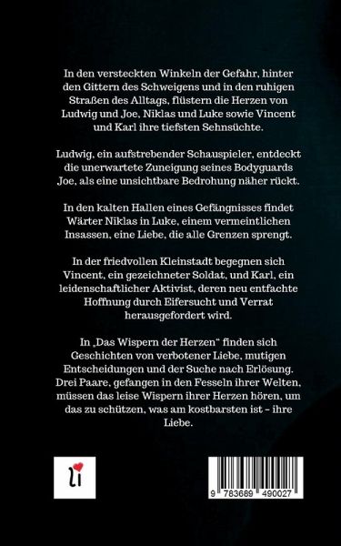 In den versteckten Winkeln der Gefahr, hinter den Gittern des Schweigens und in den ruhigen Straßen des Alltags, flüstern die Herzen von Ludwig und Joe, Niklas und Luke sowie Vincent und Karl ihre tiefsten Sehnsüchte. Ludwig, ein aufstrebender Schauspieler, entdeckt die unerwartete Zuneigung seines Bodyguards Joe, als eine unsichtbare Bedrohung näher rückt. In den kalten Hallen eines Gefängnisses findet Wärter Niklas in Luke, einem vermeintlichen Insassen, eine Liebe, die alle Grenzen sprengt. In der friedvollen Kleinstadt begegnen sich Vincent, ein gezeichneter Soldat, und Karl, ein leidenschaftlicher Aktivist, deren neu entfachte Hoffnung durch Eifersucht und Verrat herausgefordert wird. In ¿Das Wispern der Herzen¿ finden sich Geschichten von verbotener Liebe, mutigen Entscheidungen und der Suche nach Erlösung. Drei Paare, gefangen in den Fesseln ihrer Welten, müssen das leise Wispern ihrer Herzen hören, um das zu schützen, was am kostbarsten ist ¿ ihre Liebe.