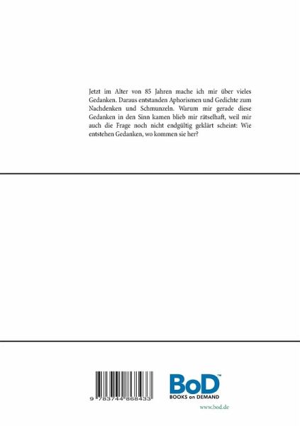 Jetzt im Alter von 85 Jahren mache ich mir über vieles Gedanken. Daraus entstanden Aphorismen und Gedichte zum Nachdenken und Schmunzeln. Warum mir gerade diese Gedanken in den Sinn kamen blieb mir rätselhaft, weil mir auch die Frage noch nicht endgültig geklärt scheint: Wie entstehen Gedanken, wo kommen sie her?