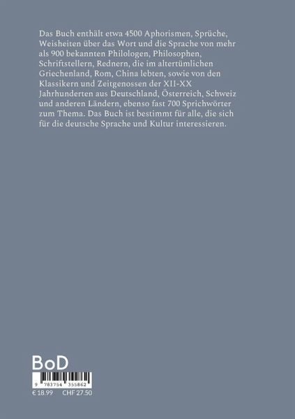 Das Buch enthält etwa 4500 Aphorismen, Sprüche, Weisheiten über das Wort und die Sprache von mehr als 900 bekannten Philologen, Philosophen, Schriftstellern, Rednern, die im altertümlichen Griechenland, Rom, China lebten, sowie von den Klassikern und Zeitgenossen der XII-XX Jahrhunderten aus Deutschland, Österreich, Schweiz und anderen Ländern, ebenso fast 700 Sprichwörter zum Thema. Das Buch ist bestimmt für alle, die sich für die deutsche Sprache und Kultur interessieren.