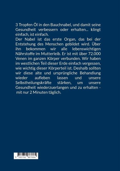 3 Tropfen Öl in den Bauchnabel, und damit seine Gesundheit verbessern oder erhalten... klingt einfach, ist einfach.Der Nabel ist das erste Organ, das bei der Entstehung des Menschen gebildet wird. Über ihn bekommen wir alle lebenswichtigen Nährstoffe im Mutterleib. Er ist mit über 72.000 Venen im ganzen Körper verbunden. Wir haben im westlichen Teil dieser Erde einfach vergessen, wie wichtig dieser Körperteil ist. Deshalb sollten wir diese alte und ursprüngliche Behandlung wieder aufleben lassen und unsere Selbstheilungskräfte stärken, um unsere Gesundheit wiederzuerlangen und zu erhalten - mit nur 2 Minuten täglich.