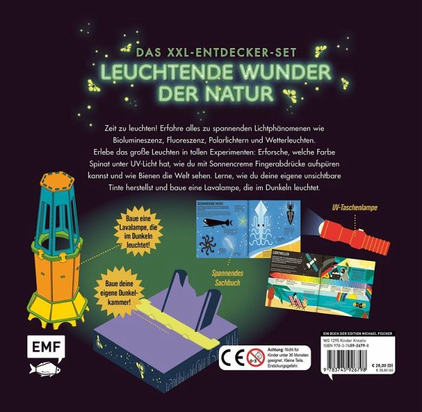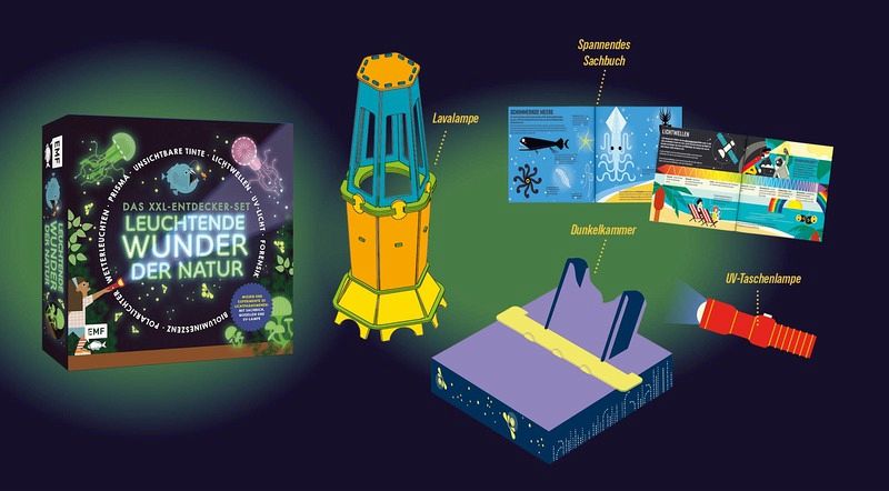 Das XXL-Set entführt kleine Entdecker ab 8 Jahren in die faszinierende Welt natürlicher Lichtphänomene. Mit spannenden Experimenten für zu Hause und Modellen zum Selberbauen macht das Lernen richtig Spaß! Zahlreiche Sachillustrationen im Buch erklären die geniale Wissenschaft hinter Biolumineszenz, Phosphoreszenz, Blitzen, Wetterleuchten und Polarlichtern. Die UV-Taschenlampe hilft dir dabei, deine Umwelt mit ganz neuen Augen zu sehen.