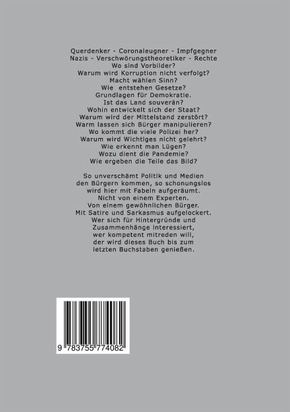 Querdenker - Coronaleugner - lmpfgegnerRechte - NazisWo sind die Vorbilder?Warum werden Korruption und Skandalenicht verfolgt?Hat Wählen einen Sinn? Wie funktioniertGesetzgebung wirklich?Ist Deutschland eine Demokratie? Ist Deutschland souverän?Wohin entwickelt sich das Land?Warum wird der Mittelstand zerstört?Warum lassen sich Bürger manipulieren?Warum werden wichtige Dinge nichtgelehrt?Wie erkennt man Lügen?Wozu dient das Virus wirklich?Wie fügen sich die einzelnen Teile zum stimmigen Bild?So unverschämt wie Politik und Medienden Bürgern kommen, so schonungsloswird hier mit Fabeln aufgeräumtNicht von einem Politiker oder Experten.Von einem gewöhnlichen Bürger.Mit Satire und Sarkasmus aufgelockert.Wer sich für Hintergründe undZusammenhänge interessiertWer kompetent mitreden will,der wird dieses Buch bis zumletzten Buchstaben genießen.Dieses Buch ist das erste von zwei und beschränkt sich auf die größeren Zusammenhänge.Es ist aber erforderlich um später Einzelheiten zu verstehen.Im Zweiten mit dem Titel SCHERBENHAUFEN geht es dann in die Details und Fachgebiete.