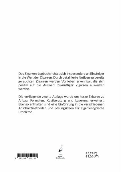 Das Zigarren-Logbuch richtet sich insbesondere an Einsteiger in die Welt der Zigarren. Durch detaillierte Notizen zu bereits gerauchten Zigarren werden Vorlieben erkennbar, die sich positiv auf die Auswahl zukünftiger Zigarren auswirken werden. Die vorliegende Zweite Auflage wurde um kurze Exkurse zu Anbau, Formaten, Kaufberatung und Lagerung erweitert. Ebenso enthalten sind eine Einführung in die verschiedenen Anschnittmethoden und Lösungsideen für zigarrentypische Probleme.