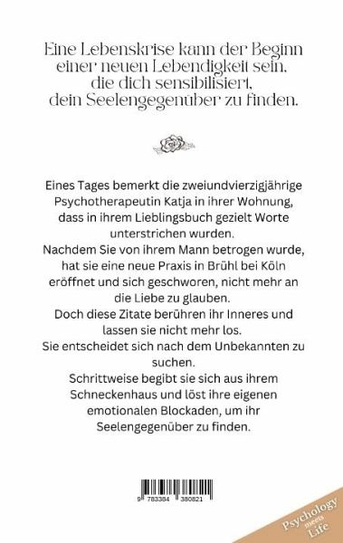 Eines Tages bemerkt die zweiundvierzigjährige Psychotherapeutin Katja in ihrer Wohnung, dass in ihrem Lieblingsbuch gezielt Worte unterstrichen wurden. Nachdem Sie von ihrem Mann betrogen wurde, hat sie eine neue Praxis in Brühl bei Köln eröffnet und sich geschworen, nicht mehr an die Liebe zu glauben. Doch diese Zitate berühren ihr Inneres und lassen sie nicht mehr los. Sie entscheidet sich nach dem Unbekannten zu suchen.Schrittweise begibt sie sich aus ihrem Schneckenhaus und löst ihre eigenen emotionalen Blockaden, um ihr Seelengegenüber zu finden.