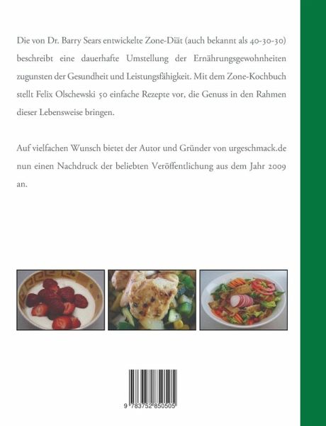 Die von Dr. Barry Sears entwickelte Zone-Diät (auch bekannt als 40-30-30) beschreibt eine dauerhafte Umstellung der Ernährungsgewohnheiten zugunsten der Gesundheit und Leistungsfähigkeit. In diesem Kochbuch stellt Felix Olschewski 50 einfache Rezepte vor, die Genuss in den Rahmen dieser Lebensweise bringen.Auf vielfachen Wunsch bietet der Autor nun einen Nachdruck der beliebten Veröffentlichung aus dem Jahr 2009 an.