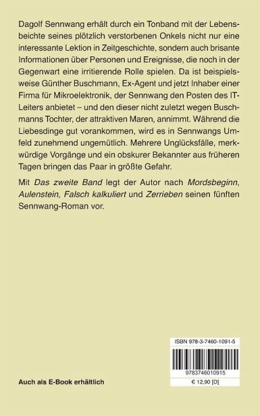 Dagolf Sennwang erhält durch ein Tonband mit der Lebensbeichte seines plötzlich verstorbenen Onkels nicht nur eine interessante Lektion in Zeitgeschichte, sondern auch brisante Informationen über Personen und Ereignisse, die noch in der Gegenwart eine irritierende Rolle spielen. Da ist beispielsweise Günther Buschmann, Ex-Agent und jetzt Inhaber einer Firma für Mikroelektronik, der Sennwang den Posten des IT-Leiters anbietet - und den dieser nicht zuletzt wegen Buschmanns Tochter, der attraktiven Maren, annimmt. Während die Liebesdinge gut vorankommen, wird es in Sennwangs Umfeld zunehmend…mehr