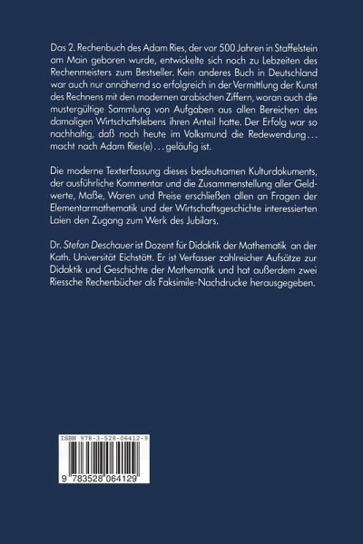 Adam Rles - Leben und Werk.- Der Text des 2. Rechenbuch. In moderner Fassung.- Der formale und Inhaltliche Aufbau des Rechenbuchs.- Kommentar.- Metrologlscher Anhang.- 1. Geldwerte.- 2. Gewichte (ggf. mit Warenangaben).- 3. Feingewichte.- 4. Längenmaße (ggf. mit Warenangaben).- 5. Hohlmaße (ggf. mit Warenangaben).- 6. Handelsübliche Lieferformen für bestimmte Waren, ggf. mit Angaben über die Taren.- 7. Stückmaße mit Warenangaben.- 8. Zeitspannen mit Bezugsangaben.- 9. Waren und Preise.- 9.1 Preise von Inlandswaren (Lebensmittel, landwirtschaftliche Produkte, Vieh, Fisch, Hilfsmittel für pharmazeutische und technische Zwecke).- 9.2 Preise von Auslandswaren (Landwirtschaftliche Produkte, Obst, Gewürze).- 9.3 Wolle, Textillien, Leder und Felle.- 9.4 Metallwaren und Metalle.- 9.5 Sonstiges.- 10. Diemstleistungen und Löhne.- 11. Zinsen.- 12. Zoll.- 14. Sonstiges.- Personen- und Berufsgruppen.- Eigennamen.- Städte.- Literatur.