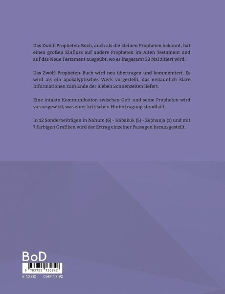Das Zwölf-Propheten-Buch, auch als die kleinen Propheten bekannt, hat einen großen Einfluss auf andere Propheten im Alten Testament und auf das Neue Testament ausgeübt, wo es insgesamt 33 Mal zitiert wird.Das Zwölf-Propheten-Buch wird neu übertragen und kommentiert. Es wird als ein apokalyptisches Werk vorgestellt, das erstaunlich klare Informationen zum Ende der Sieben Sonnenzeiten liefert.Eine intakte Kommunikation zwischen Gott und seine Propheten wird vorausgesetzt, was einer kritischen Hinterfragung standhält.In 12 Sonderbeiträgen in Nahum (6) - Habakuk (5) - Zephanja (1) und mit 7 farbigen Grafiken wird der Ertrag einzelner Passagen herausgestellt.