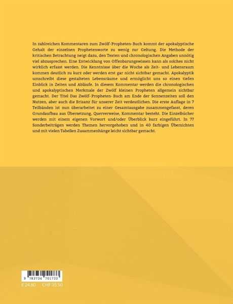 In zahlreichen Kommentaren zum Zwölf-Propheten-Buch kommt der apokalyptische Gehalt der einzelnen Prophetenworte zu wenig zur Geltung. Die Methode der kritischen Betrachtung neigt dazu, den Texten und chronologischen Angaben unnötig viel abzusprechen. Offenbarungswissen kann als solches nicht wirklich erfasst werden. Die Kenntnisse über die Woche als Zeit- und Lebensraum kommen deutlich zu kurz oder werden erst gar nicht sichtbar gemacht. Apokalyptik umschreibt diese gestalteten Lebensräume und ermöglicht uns so einen tiefen Einblick in die Abläufe. In diesem Kommentar werden die chronologischen und apokalyptischen Merkmale im Zwölf-Propheten-Buch allgemein sichtbar gemacht werden.Der Titel Das Zwölf-Propheten-Buch am Ende der Sonnenzeiten soll den Nutzen, aber auch die Brisanz für unserer Zeit verdeutlichen. Die erste Auflage erschien in Teilbänden von 2021-2022 und ist nun überarbeitet zu einer Gesamtausgabe zusammengefasst, deren Grundaufbau aus Übersetzung, Querverweise, Kommentar besteht. Die Einzelbücher werden mit einem eigenen Vorwort und/oder Überblick kurz eingeführt. Achtzig Sonderbeiträge heben bestimmte Themen hervor und arbeiten den Nutzen heraus. In vierzig farbigen Übersichten werden überwiegend zeitliche Zusammenhänge leicht sichtbar gemacht. Zahlreiche Tabellen und Vergleiche ermöglichen einen schnellen Einblick in die Chronologie der Texte sowie in verwandte Bereiche.