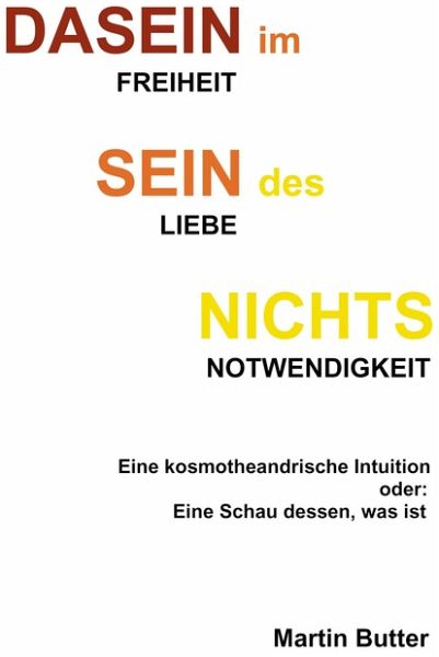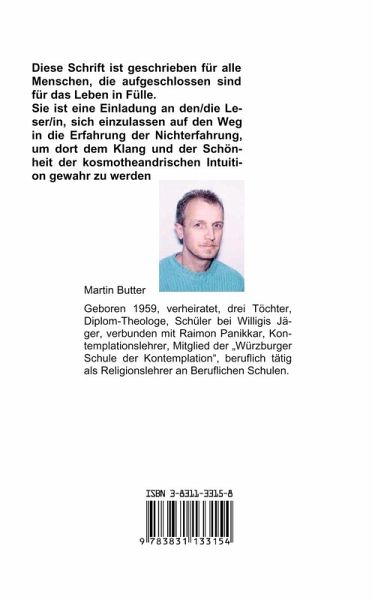 Das Buch Geschrieben für alle Menschen, die aufgeschlossen sind für das Leben in Fülle. Ein Versuch, die kosmotheandrische Intuition in den Bereich des Sinnlichen zu heben. Das Ergebnis eines jahrelangen Ringens um Worte, die durchlässig sind für die in Worten nicht fassbare kosmotheandrische Intuition. Ein Wechsel von konzentrierter Sprache und Gedichten. Die Intention, als Mittler zu dienen zwischen der Erfahrungswelt der Leserin/des Lesers und der kosmotheandrischen Intuition. Eine Einladung, sich einzulassen auf den Weg in die Erfahrung der Nichterfahrung. Die Hoffnung, Möglichkeiten für Begegnungen zu eröffnen, dort, wo Trennung und Widerspruch herrscht. Auszüge unter: martin.butter.bei.t-online.de